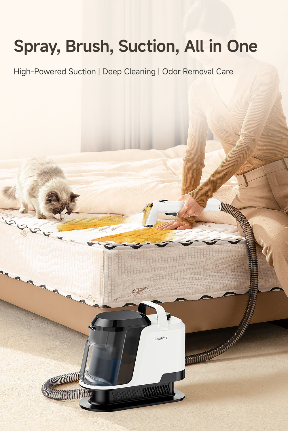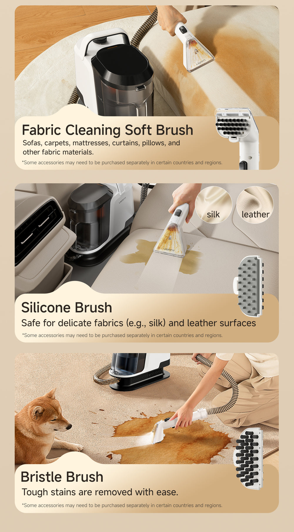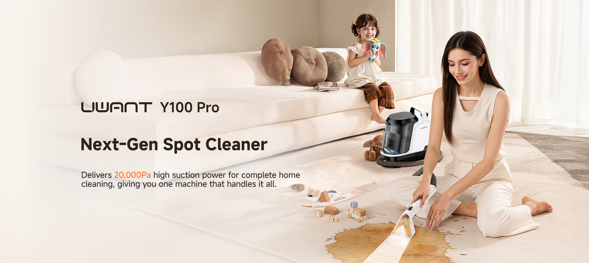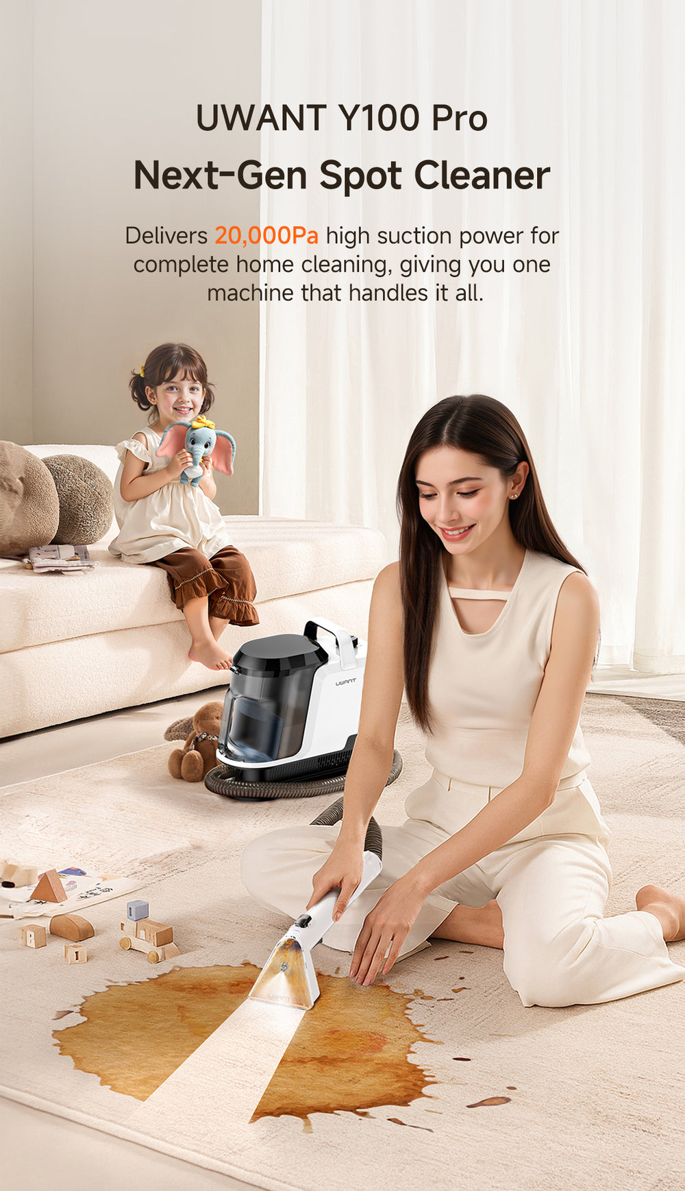 The Y100 Pro is designed for multi-surface spot cleaning, including sofas, carpets, mattresses, curtains, car seats, pillows, shoes, and even delicate fabrics or leather. With multiple interchangeable brushes, you can safely clean different materials without damage.