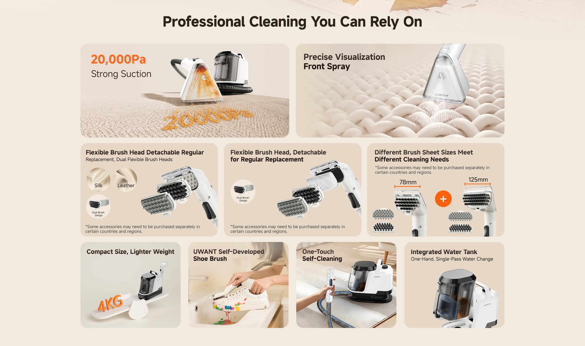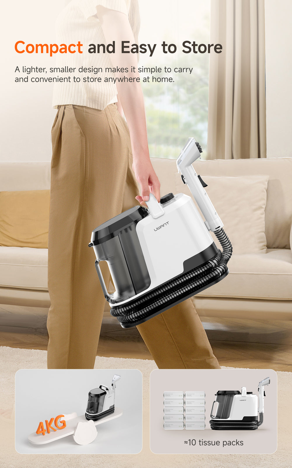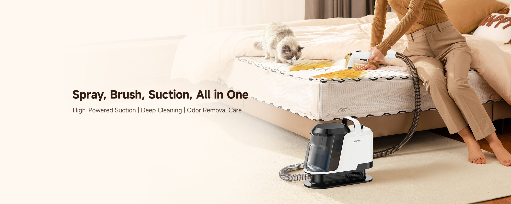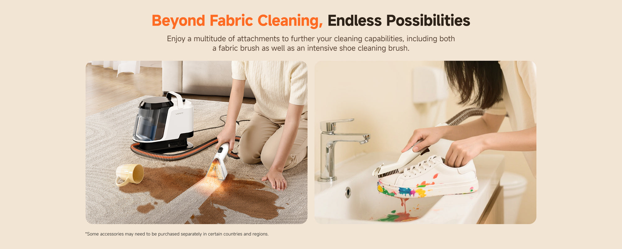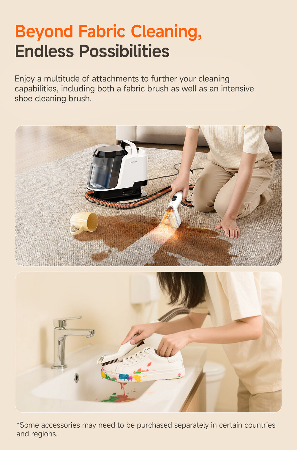 The Y100 Pro is designed for multi-surface spot cleaning, including sofas, carpets, mattresses, curtains, car seats, pillows, shoes, and even delicate fabrics or leather. With multiple interchangeable brushes, you can safely clean different materials without damage.