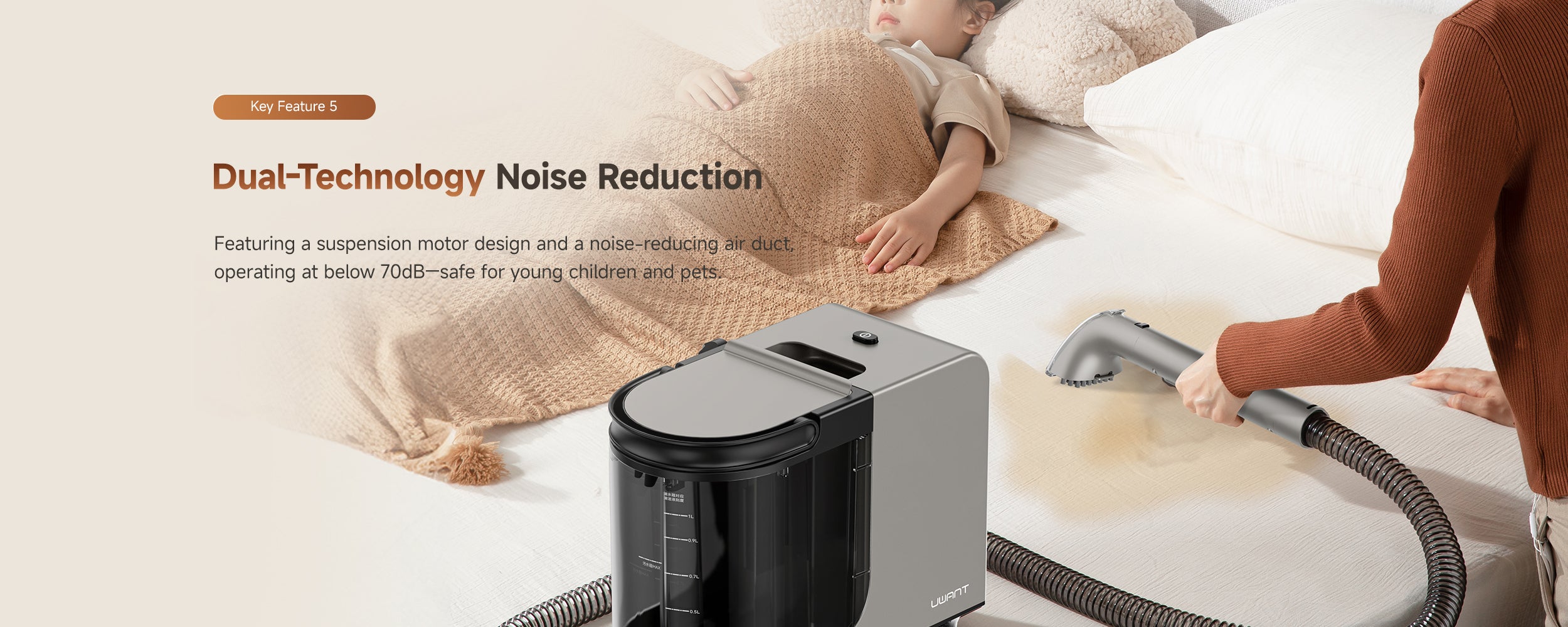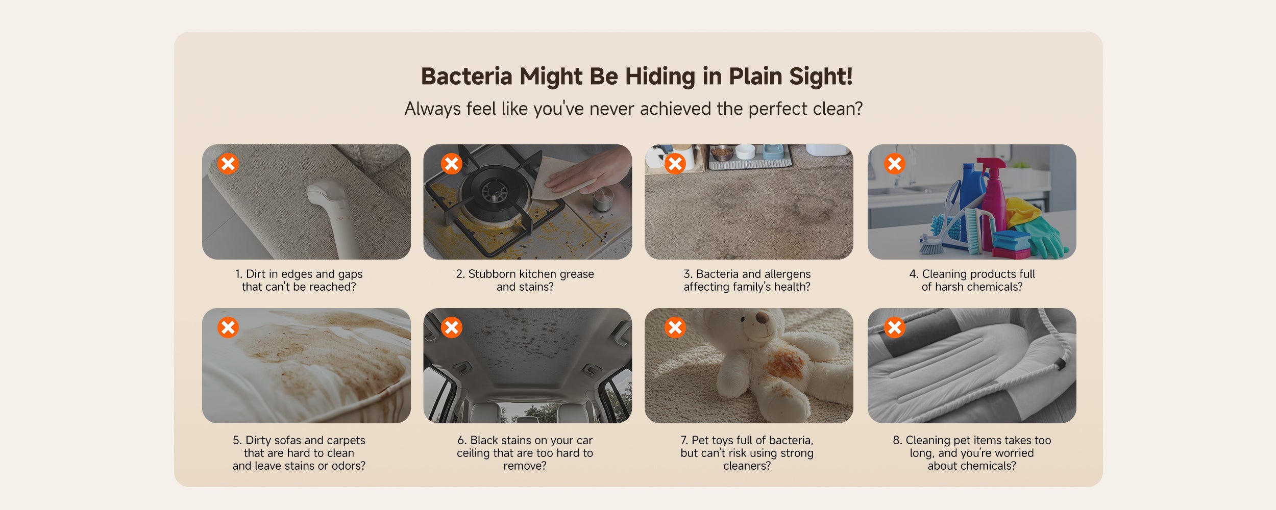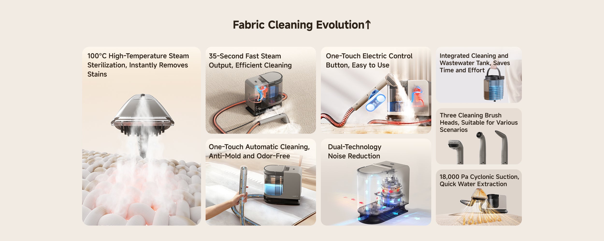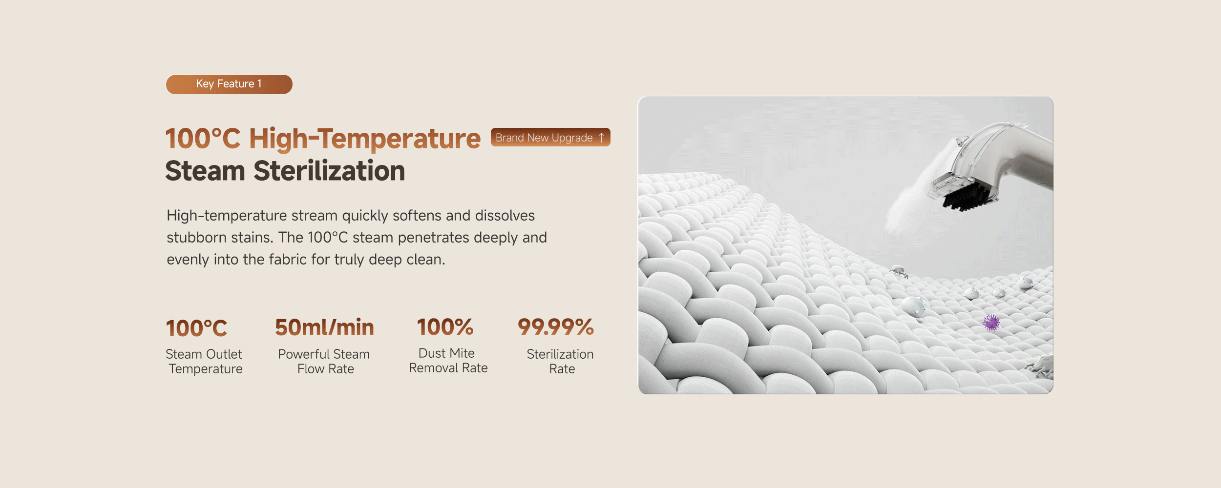 The high-temperature steam provides deep sterilization, instantly loosening and removing stubborn stains while also killing bacteria and mites, perfect for homes with pets or children