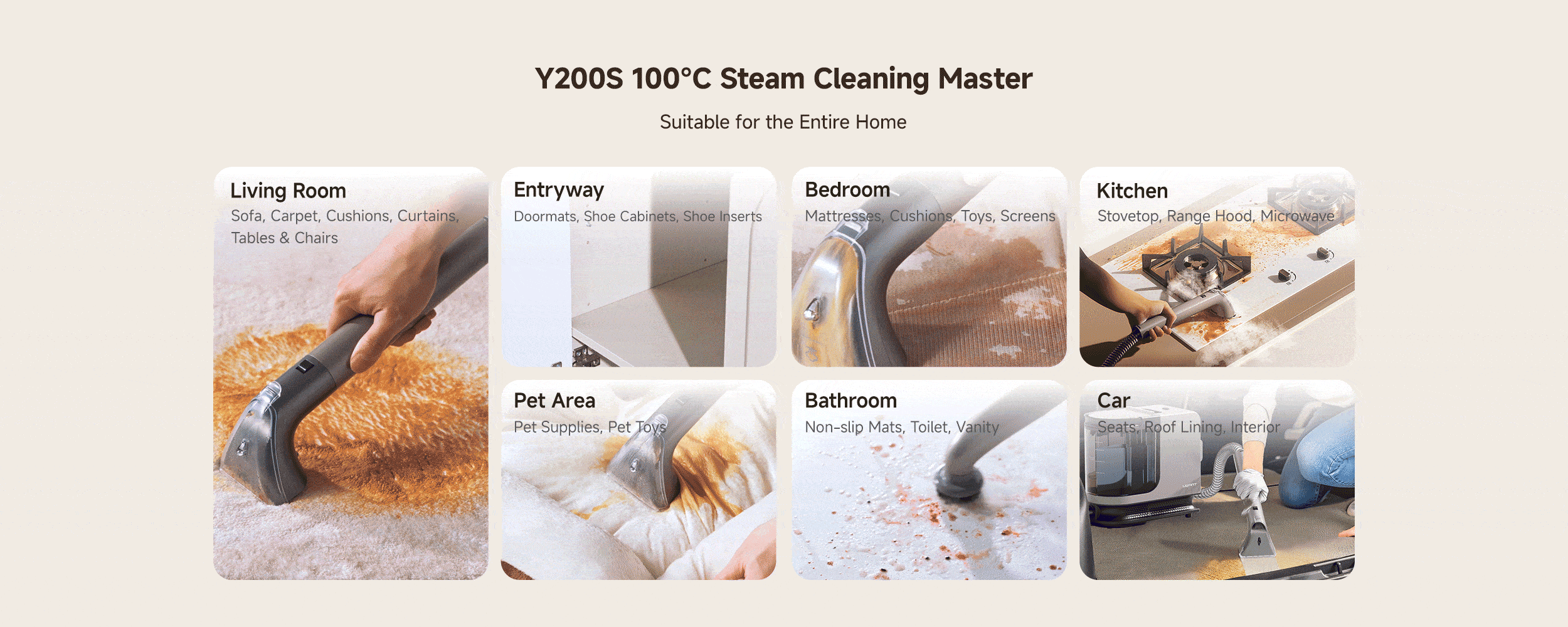 The Y200 Steam comes with three cleaning brush heads, making it suitable for carpet, sofa, mattress, curtain, and car interior. YOu can choose the right brush depending on the fabric or surface.